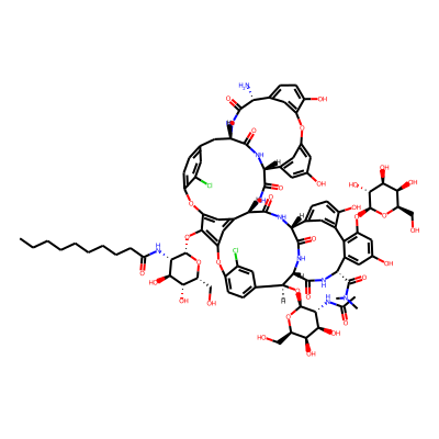 CN(C)C(=O)C1NC(=O)C2NC(=O)C(NC(=O)C3NC(=O)C4NC(=O)C(Cc5ccc(c(Cl)c5)Oc5cc3cc(c5O)Oc3ccc(cc3Cl)C2O)NC(=O)C(N)c2ccc(O)c(c2)Oc2cc(O)cc4c2)c2ccc(O)c(c2)-c2c(O)cc(O)cc21| HBA: | 25 | RingCount: | 13 |