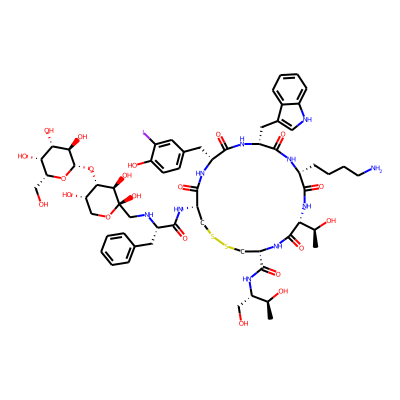 CNC(Cc1ccccc1)C(=O)NC1CSSCC(C(=O)NC(CO)C(C)O)NC(=O)C(C(C)O)NC(=O)C(CCCCN)NC(=O)C(Cc2c[nH]c3ccccc23)NC(=O)C(Cc2ccc(O)c(I)c2)NC1=O| HBA: | 21 | RingCount: | 5 |