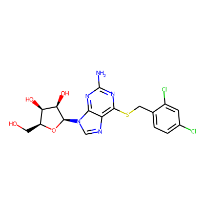 Nc1nc2c(c(SCc3ccc(Cl)cc3Cl)n1)N=C[N]2| HBA: | 5 | RingCount: | 3 |