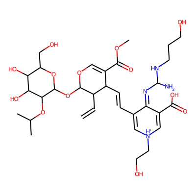 C=CC1C(O)OC=C(C(=O)OC)C1C=CC1=C[NH+](CCO)C=C(C(=O)O)C1=NC(N)NCCCO| HBA: | 12 | RingCount: | 2 |
