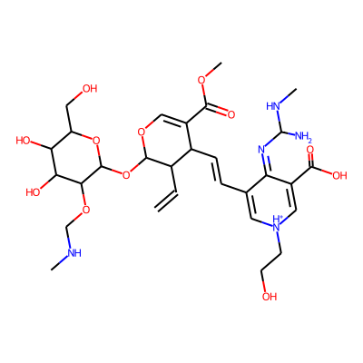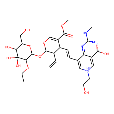 C=CC1C(O)OC=C(C(=O)OC)C1C=CC1=C[NH+](CCO)C=C(C(=O)O)C1=NC(N)NC| HBA: | 11 | RingCount: | 2 |