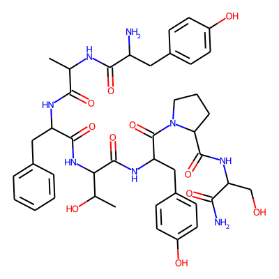 CC(NC(=O)C(N)Cc1ccc(O)cc1)C(=O)NC(Cc1ccccc1)C(=O)NC(C(=O)NC(Cc1ccc(O)cc1)C(=O)N1CCCC1C(=O)NC(CO)C(N)=O)C(C)O| HBA: | 19 | RingCount: | 4 |