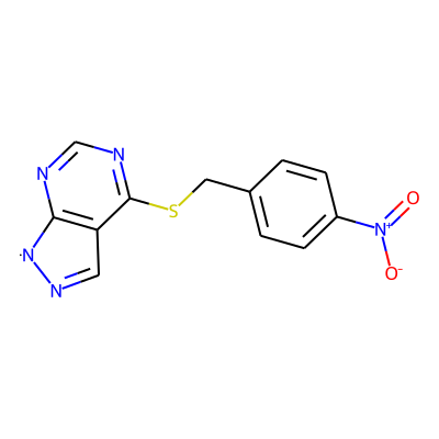 O=[N+]([O-])c1ccc(CSc2ncnc3c2C=N[N]3)cc1| HBA: | 7 | RingCount: | 3 |