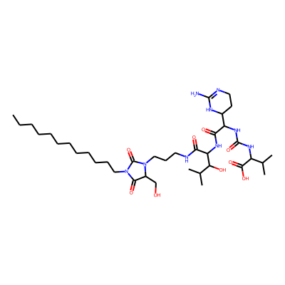 CCCCCCCCCCCCN1C(=O)C(CO)N(CCCNC(=O)C(NC(=O)C(NC(=O)NC(C(=O)O)C(C)C)C2CCN=C(N)N2)C(O)C(C)C)C1=O| HBA: | 18 | RingCount: | 2 |