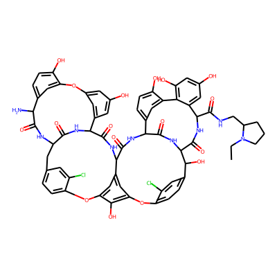 CCN1CCCC1CNC(=O)C1NC(=O)C2NC(=O)C(NC(=O)C3NC(=O)C4NC(=O)C(Cc5ccc(c(Cl)c5)Oc5cc3cc(c5O)Oc3ccc(cc3Cl)C2O)NC(=O)C(N)c2ccc(O)c(c2)Oc2cc(O)cc4c2)c2ccc(O)c(c2)-c2c(O)cc(O)cc21| HBA: | 26 | RingCount: | 14 |