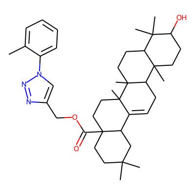 Cc1ccccc1-n1cc(COC(=O)C23CCC(C)(C)CC2C2=CCC4C5(C)CCC(O)C(C)(C)C5CCC4(C)C2(C)CC3)nn1| HBA: | 6 | RingCount: | 7 |