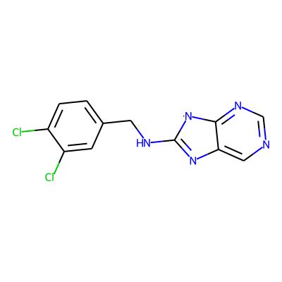 Clc1ccc(CNC2=Nc3cncnc3[N]2)cc1Cl| HBA: | 5 | RingCount: | 3 |