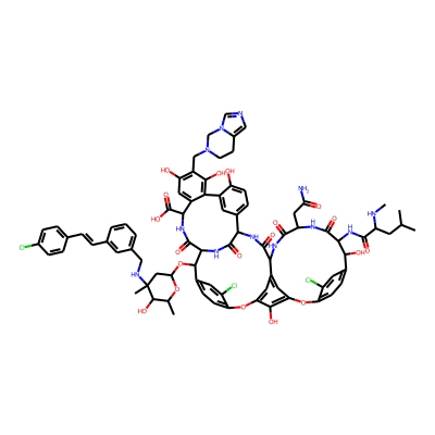 CNC(CC(C)C)C(=O)NC1C(=O)NC(CC(N)=O)C(=O)NC2C(=O)NC3C(=O)NC(C(=O)NC(C(=O)O)c4cc(O)c(CN5CCc6cncn6C5)c(O)c4-c4cc3ccc4O)C(OC3CC(C)(NCc4cccc(C=Cc5ccc(Cl)cc5)c4)C(O)C(C)O3)c3ccc(c(Cl)c3)Oc3cc2cc(c3O)Oc2ccc(cc2Cl)C1O| HBA: | 31 | RingCount: | 15 |