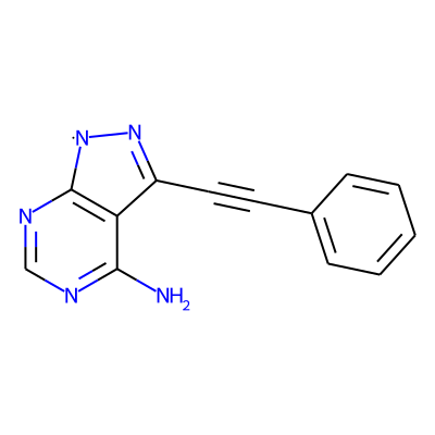 Nc1ncnc2c1C(C#Cc1ccccc1)=N[N]2| HBA: | 5 | RingCount: | 3 |