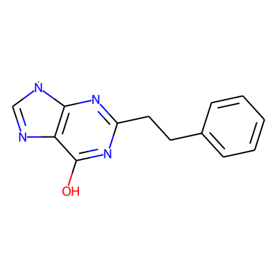 Oc1nc(CCc2ccccc2)nc2c1N=C[N]2| HBA: | 5 | RingCount: | 3 |