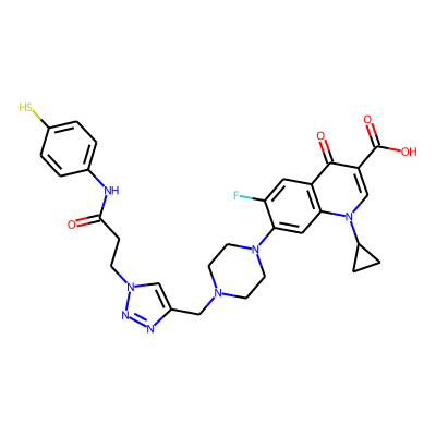 O=C(CCn1cc(CN2CCN(c3cc4c(cc3F)c(=O)c(C(=O)O)cn4C3CC3)CC2)nn1)Nc1ccc(S)cc1Sugarmoiety: