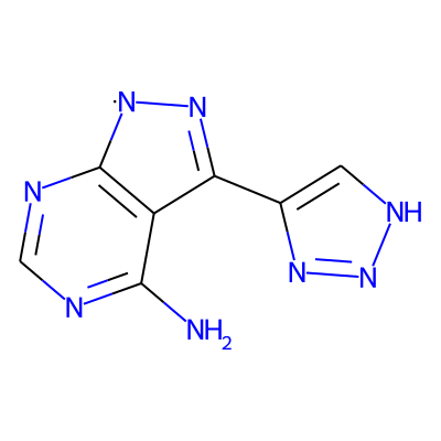 Nc1ncnc2c1C(c1c[nH]nn1)=N[N]2| HBA: | 8 | RingCount: | 3 |