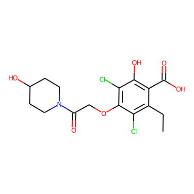 CCc1c(Cl)c(OCC(=O)N2CCC(O)CC2)c(Cl)c(O)c1C(=O)O| HBA: | 7 | RingCount: | 2 |