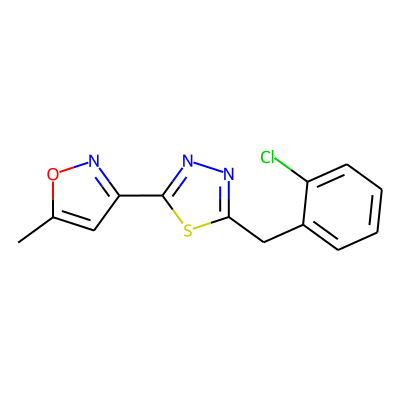 Cc1cc(-c2nnc(Cc3ccccc3Cl)s2)no1| HBA: | 4 | RingCount: | 3 |