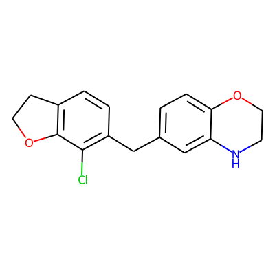 Clc1c(Cc2ccc3c(c2)NCCO3)ccc2c1OCC2| HBA: | 3 | RingCount: | 4 |