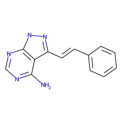 Nc1ncnc2c1C(C=Cc1ccccc1)=N[N]2| HBA: | 5 | RingCount: | 3 |