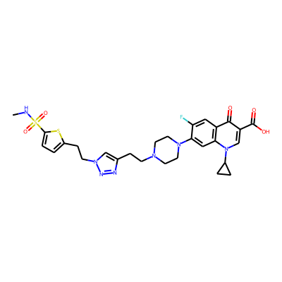 CNS(=O)(=O)c1ccc(CCn2cc(CCN3CCN(c4cc5c(cc4F)c(=O)c(C(=O)O)cn5C4CC4)CC3)nn2)s1| HBA: | 12 | RingCount: | 6 |