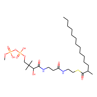 CCCCCCCCCCCCC(C)C(=O)SCCNC(=O)CCNC(=O)C(O)C(C)(C)COP(=O)(O)OP(=O)(O)OC| HBA: | 13 | RingCount: | 0 |