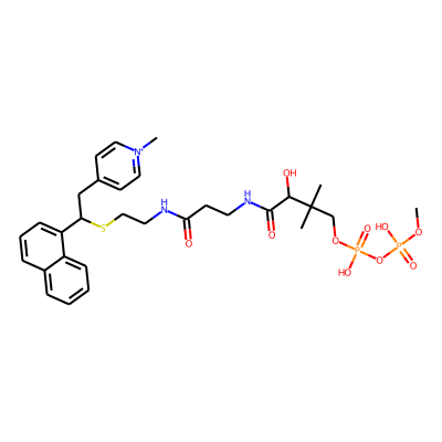COP(=O)(O)OP(=O)(O)OCC(C)(C)C(O)C(=O)NCCC(=O)NCCSC(Cc1cc[n+](C)cc1)c1cccc2ccccc12| HBA: | 13 | RingCount: | 3 |