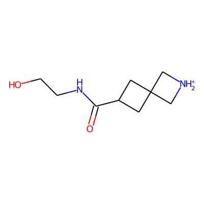 O=C(NCCO)C1CC2(C[NH2+]C2)C1| HBA: | 4 | RingCount: | 2 |