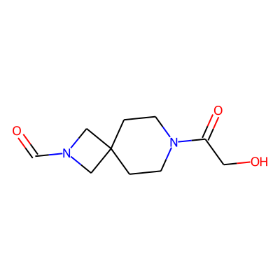 O=CN1CC2(CCN(C(=O)CO)CC2)C1| HBA: | 5 | RingCount: | 2 |