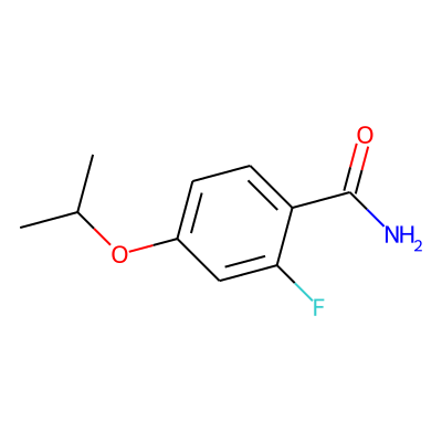CC(C)Oc1ccc(C(N)=O)c(F)c1| HBA: | 3 | RingCount: | 1 |