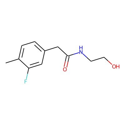 Cc1ccc(CC(=O)NCCO)cc1F| HBA: | 3 | RingCount: | 1 |
