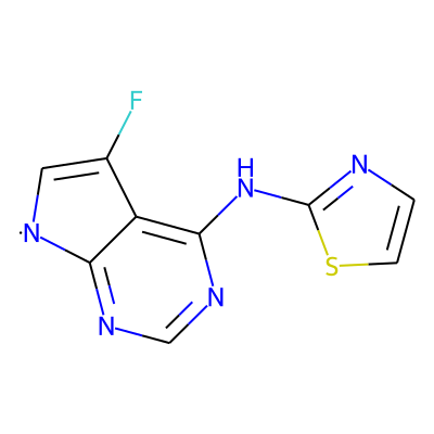 FC1=C[N]c2ncnc(Nc3nccs3)c21| HBA: | 5 | RingCount: | 3 |