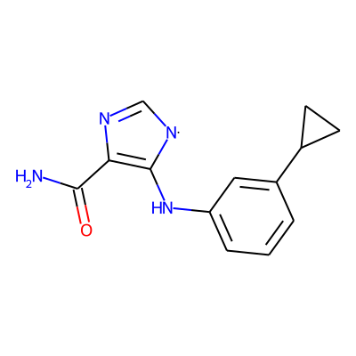 NC(=O)C1=C(Nc2cccc(C3CC3)c2)[N]C=N1| HBA: | 5 | RingCount: | 3 |