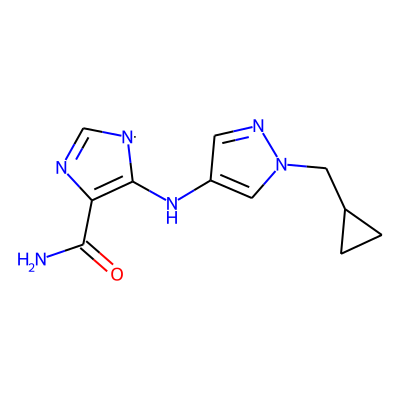 NC(=O)C1=C(Nc2cnn(CC3CC3)c2)[N]C=N1| HBA: | 7 | RingCount: | 3 |