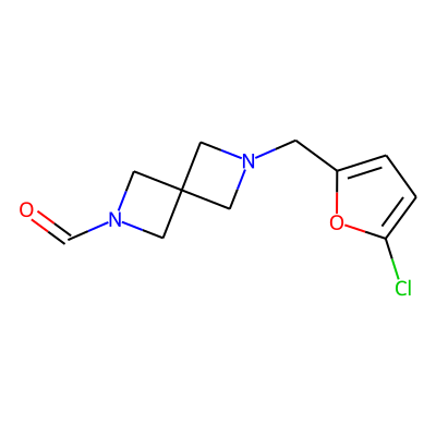 O=CN1CC2(C1)CN(Cc1ccc(Cl)o1)C2| HBA: | 4 | RingCount: | 3 |