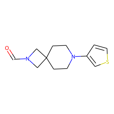 O=CN1CC2(CCN(c3ccsc3)CC2)C1| HBA: | 3 | RingCount: | 3 |