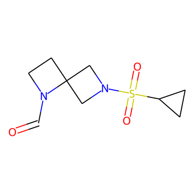 O=CN1CCC12CN(S(=O)(=O)C1CC1)C2| HBA: | 5 | RingCount: | 3 |