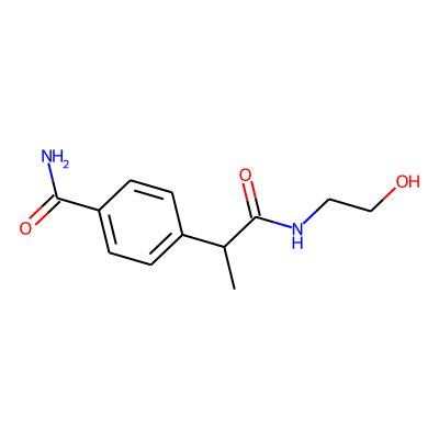 CC(C(=O)NCCO)c1ccc(C(N)=O)cc1| HBA: | 5 | RingCount: | 1 |