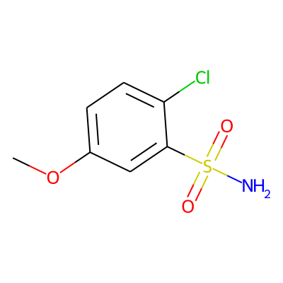 COc1ccc(Cl)c(S(N)(=O)=O)c1| HBA: | 4 | RingCount: | 1 |