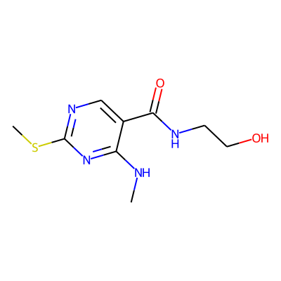 CNc1nc(SC)ncc1C(=O)NCCO| HBA: | 6 | RingCount: | 1 |