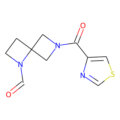O=CN1CCC12CN(C(=O)c1cscn1)C2| HBA: | 5 | RingCount: | 3 |