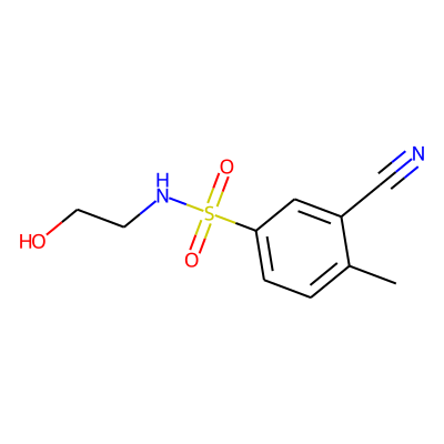 Cc1ccc(S(=O)(=O)NCCO)cc1C#N| HBA: | 5 | RingCount: | 1 |
