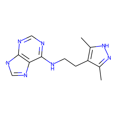 Cc1n[nH]c(C)c1CCNc1ncnc2c1N=C[N]2| HBA: | 7 | RingCount: | 3 |