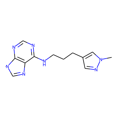 Cn1cc(CCCNc2ncnc3c2N=C[N]3)cn1| HBA: | 7 | RingCount: | 3 |