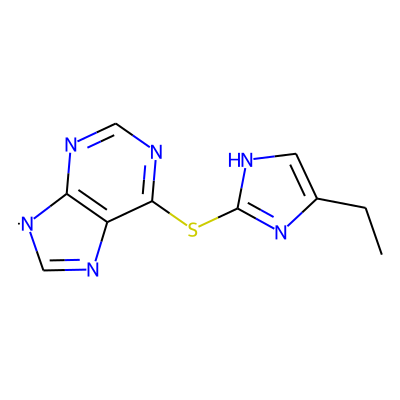 CCc1c[nH]c(Sc2ncnc3c2N=C[N]3)n1| HBA: | 6 | RingCount: | 3 |