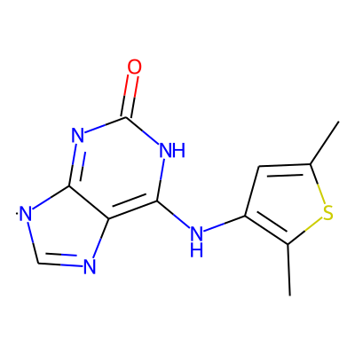 Cc1cc(Nc2[nH]c(=O)nc3c2N=C[N]3)c(C)s1| HBA: | 6 | RingCount: | 3 |