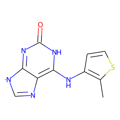 Cc1sccc1Nc1[nH]c(=O)nc2c1N=C[N]2| HBA: | 6 | RingCount: | 3 |