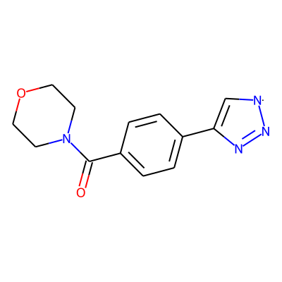 O=C(c1ccc(C2=C[N]N=N2)cc1)N1CCOCC1| HBA: | 6 | RingCount: | 3 |