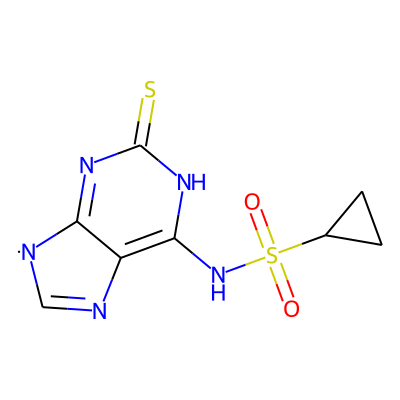 O=S(=O)(Nc1[nH]c(=S)nc2c1N=C[N]2)C1CC1| HBA: | 7 | RingCount: | 3 |