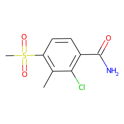 Cc1c(S(C)(=O)=O)ccc(C(N)=O)c1Cl| HBA: | 4 | RingCount: | 1 |