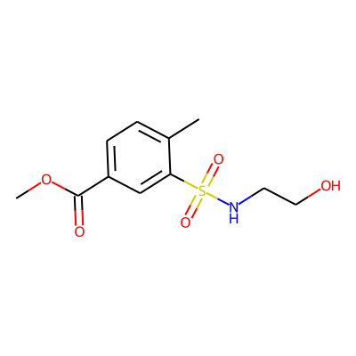COC(=O)c1ccc(C)c(S(=O)(=O)NCCO)c1| HBA: | 6 | RingCount: | 1 |