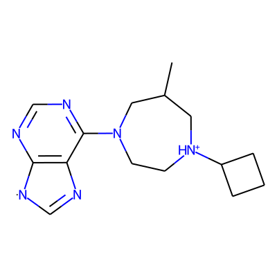 CC1CN(c2ncnc3c2N=C[N]3)CC[NH+](C2CCC2)C1| HBA: | 6 | RingCount: | 4 |