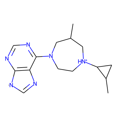 CC1CN(c2ncnc3c2N=C[N]3)CC[NH+](C2CC2C)C1| HBA: | 6 | RingCount: | 4 |