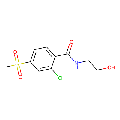 CS(=O)(=O)c1ccc(C(=O)NCCO)c(Cl)c1| HBA: | 5 | RingCount: | 1 |
